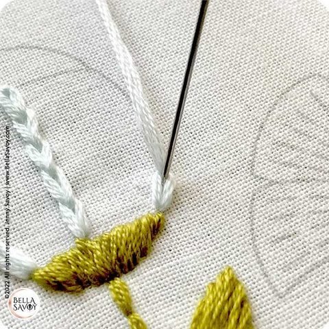 The satin stitch is used to fill in shapes and can be horizontal, vertical, or diagonal. Rows of thread are laid parallel next to each other to create a fill. There are a few ways to do this (you can find them in my satin stitch post) but here we’ll focus on one method using the receptacle of a flower.