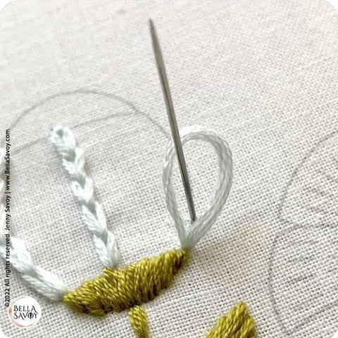 You can go ahead and pull your needle all the way through and allow the loop to naturally fall into place as the thread tightens. This will give you a smooth, clean chain stitch.