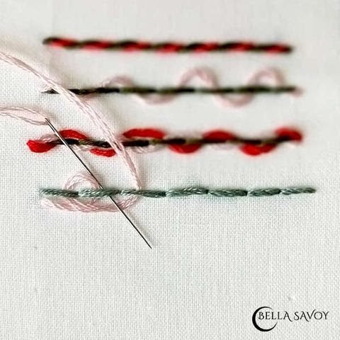 This back stitch variation takes what you just learned, the threaded back stitch, and adds another thread which ‘slithers’ on the other side.