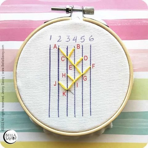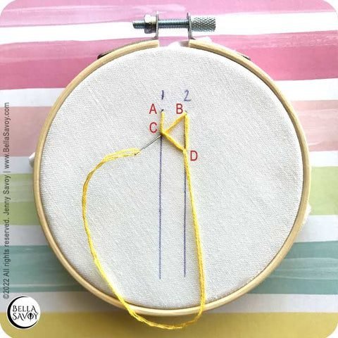 Come up at C, above your loose thread & pull through to form the first ‘V’.