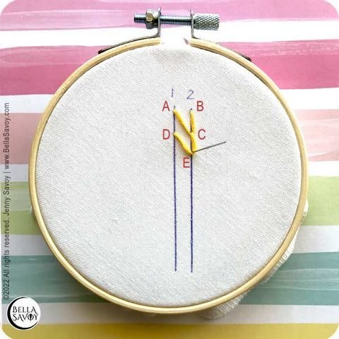 Come up over your loop on line 2 at D. Then pull your thread through. Repeat steps.