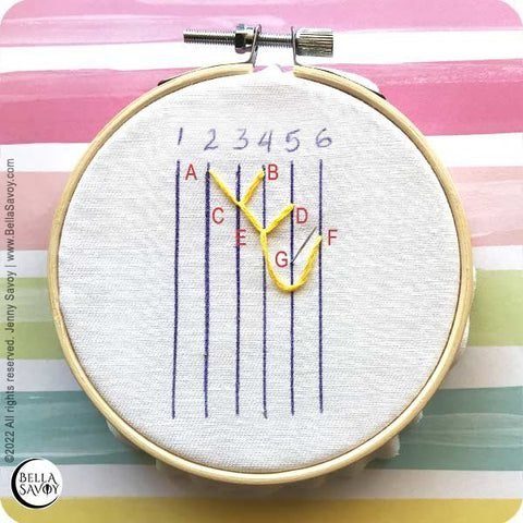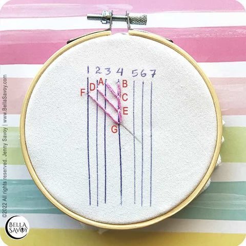 And do this one more time to the right. Return to the back at F to form a loose loop, then pull your thread through at G.