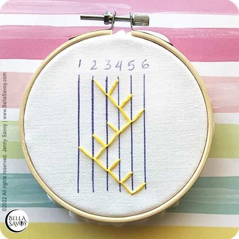 It starts off like the fly stitch which uses the basic ‘V’ shape and ends up looking like a bunch of ‘V’s that stagger from side to side.