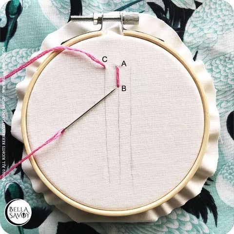 The second method begins by creating a back stitch along the center guideline, which will serve as the foundation for your fern stitch. Once this is in place, you can easily build the fern shape with the following steps.