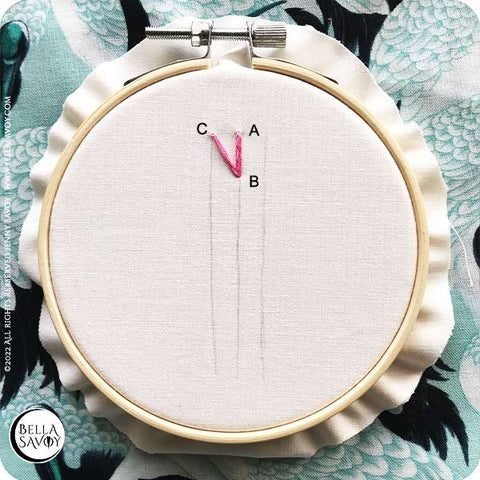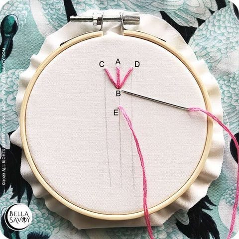 Return to the back at the bottom of the center stitch to create a 45° angle. (B)