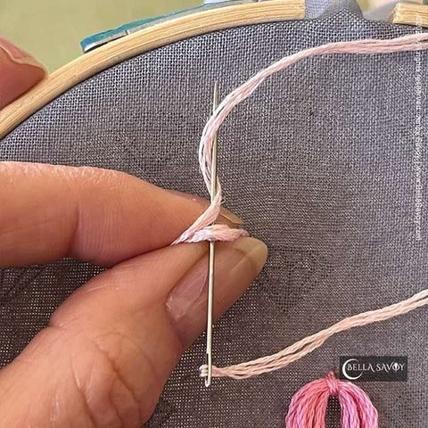 Carefully push your needle halfway through the loops and lift gently off the fabric, and with your other hand pinch the loops (below the needle) with your fingers. Then wrap the thread over and around the needle and carefully pull it through to form a knot.