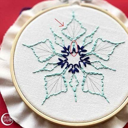 Back stitch the center of your snowflake using 4 strands of dmc #820. Add a little seed stitch where you see the little red circle below. Oops, ignore that red arrow… it’s just pointing to the back stitch from step one.