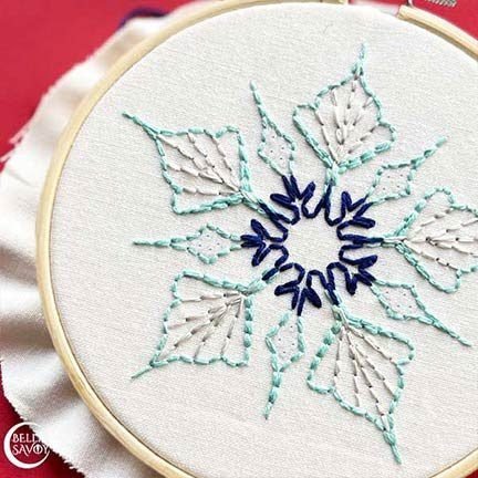 Use 4 strands of dmc #964 to outline the outer pointy extensions of the snowflake with the back stitch. Leave the center unstitched.