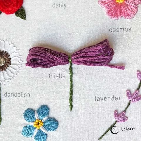 In part 1, we went over how to make the rose, daisy, cosmos, and lavender using the free flower template download I provided. Now, it’s time to move on to the next three flowers in this embroidery stitch along: the dandelion, forget-me-not, and thistle. Whether you’re joining us for the first time or following along from the beginning, this is a fun and relaxing way to improve your skills while creating something beautiful.